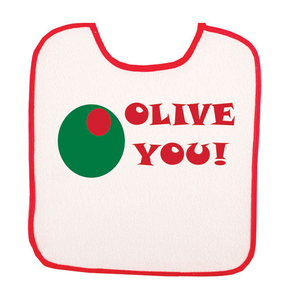 Unit price perWrap your little one in love with our "Olive You" baby bib, featuring a charming font in Italian red adorned with a Castelvetrano Italian olive. This bib ensures mealtimes stay mess-free.