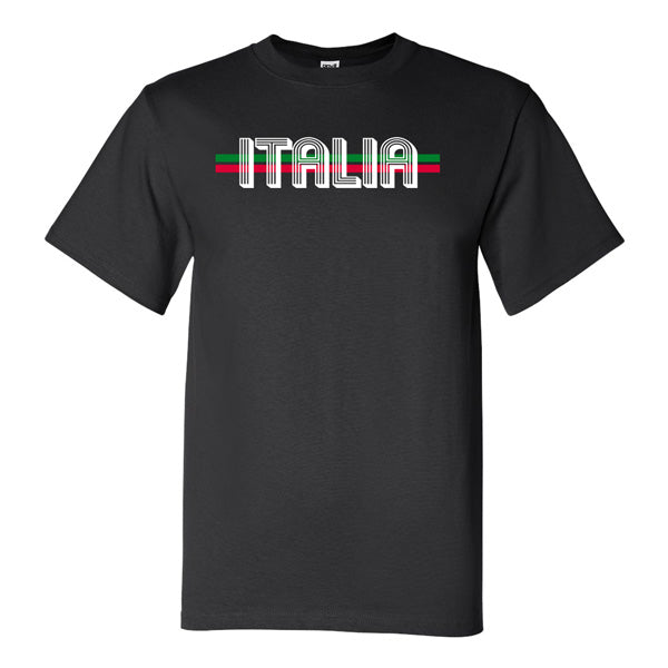 Unit price perThis stylish youth black t-shirt features "Italia" in a bold retro font that pays homage to classic Italian flair. Accentuated in green and red lines beneath the text, it's perfect for showing off a love for Italy with a trendy twist.